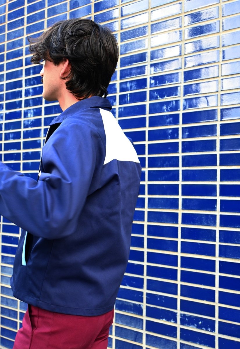 ThisĀ color block designĀ features aĀ gorgeous mediumĀ navy tone body with accents in light blue on the welt pockets and inner cuffs, a pink chest pocket flap, and a bright white rear yoke panel.Ā